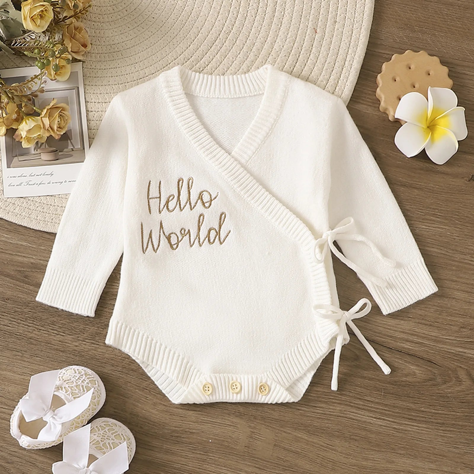 The 2025 Apparel Collection introduces the NEW Wrap Romper, "Hello World," designed with both style and comfort in mind. Perfect for gifting or dressing your newborn for special occasions, this timeless knitted romper enhances your baby's natural charm while providing gentle comfort.