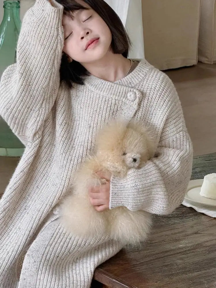 Long Maxi Cardigan, ribbed cotton knit. Beige tone to compliment autumnal tones.