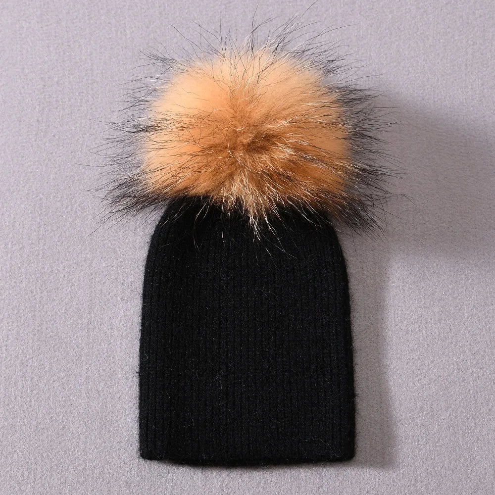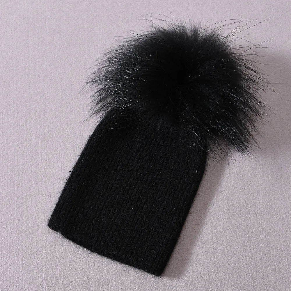 Newborn Winter Warm Cashmere Hat with Real Raccoon Fur Pom-Pom