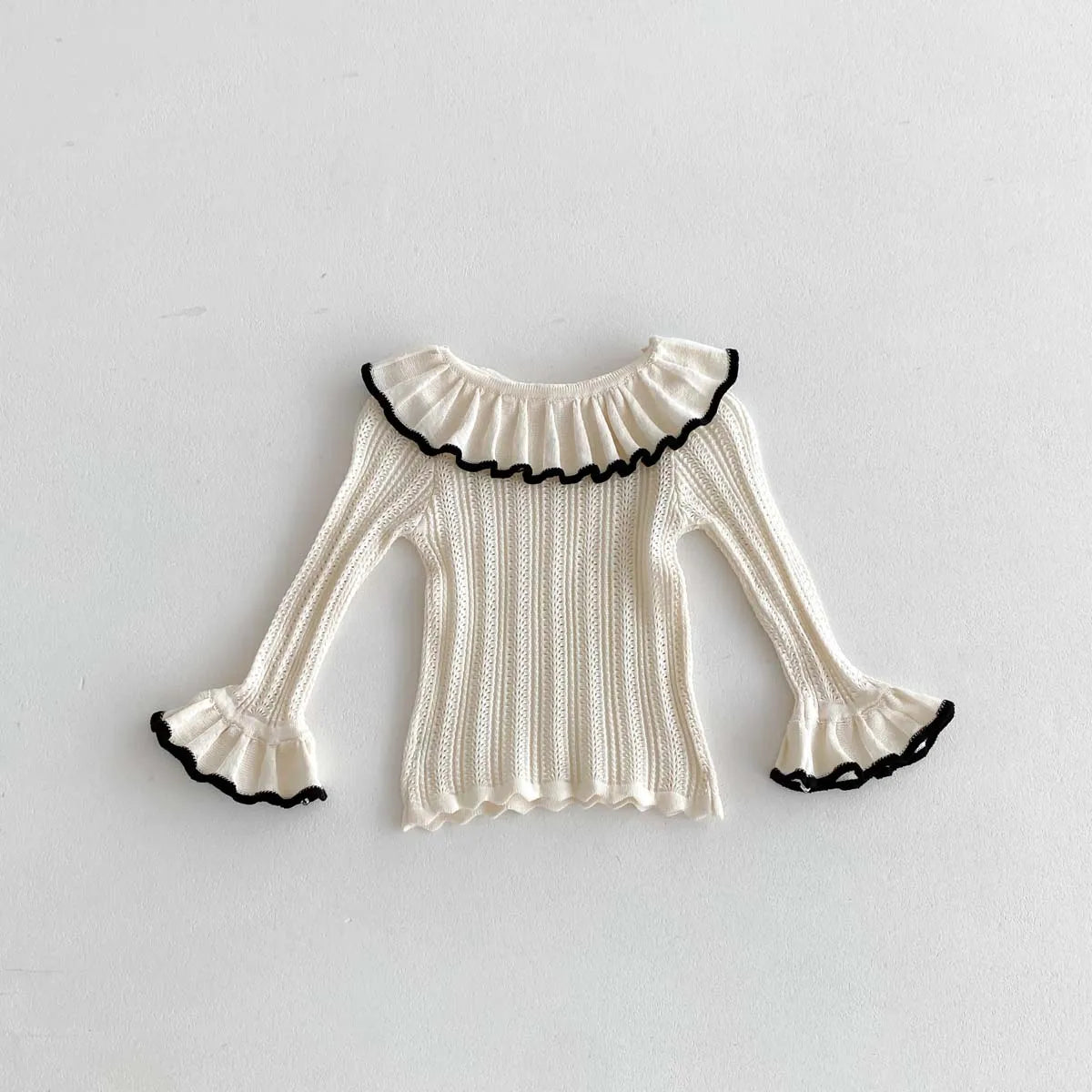 This charming autumn outfit features a knitted doll collar long-sleeve top paired with a lace skirt, both made from organic cotton to provide warmth and comfort for your little one.